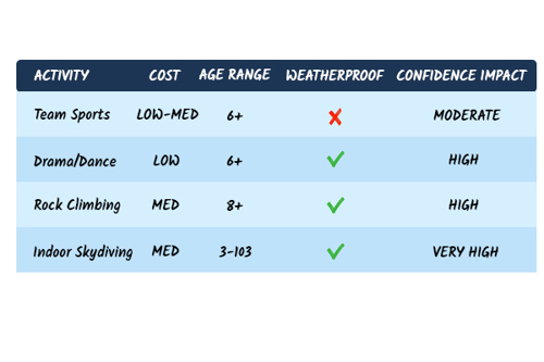 Let’s take a look at how indoor skydiving compares with other UK activities known for their confidence-building power.